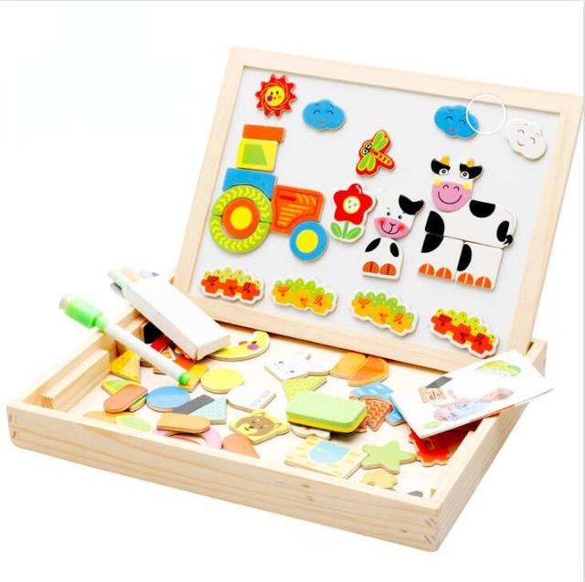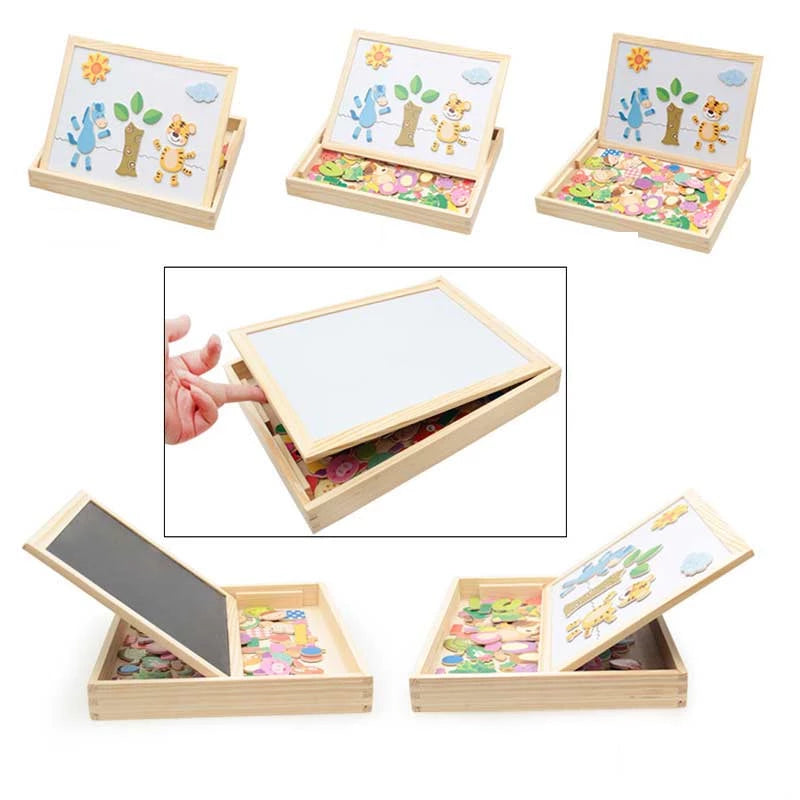 My toddler loves this toy! He has been playing with it for almost 4 months now. In the beginning, he mostly enjoyed sorting the pieces and randomly covering the board with them. I think it's better than a simple puzzle because it's an open-ended toy that also encourages creativity. We haven't used it for drawing yet, but in my opinion it's worth buying just for the magnetic board and the pieces!