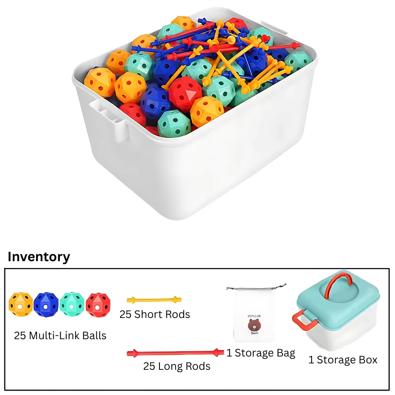 - Set Includes: 75pcs, 25 Mulit-Link Balls, 25 Short Rods, 25 Long Rods