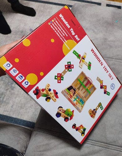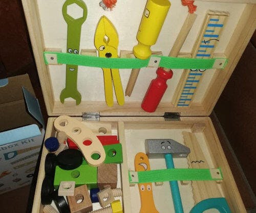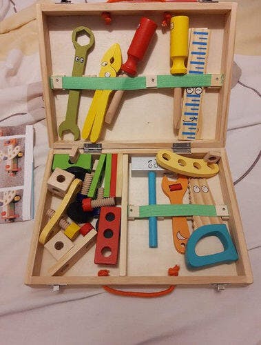 I received the tool case well, and I'm very happy with it. The material is wooden, and the tools are colorful.