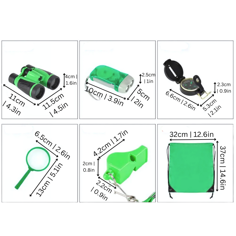 - Set Includes: 1x Binoculars, 1x Magnifying Glasses, 1x Torch, 1x Compass, 1x Fox Whistle & 1x Bag